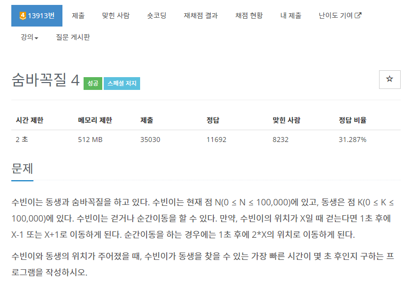 1697번: 숨바꼭질 수빈이는 동생과 숨바꼭질을 하고 있다. 수빈이는 현재 점 N(0 ≤ N ≤ 100,000)에 있고, 동생은 점 K(0 ≤ K ≤ 100,000)에 있다. 수빈이는 걷거나 순간이동을 할 수 있다. 만약, 수빈이