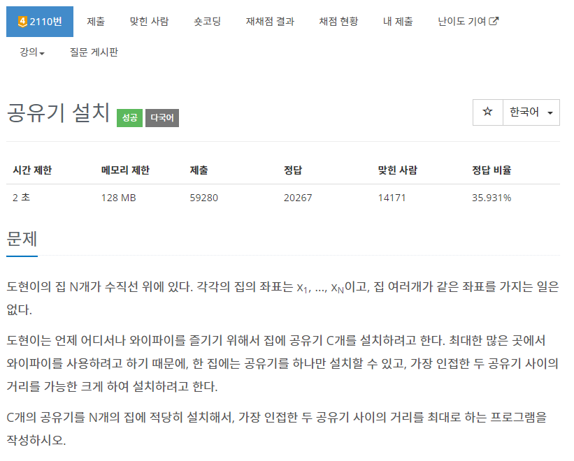 이전에 해결한 백준 1654번 랜선 자르기와 유사한 Parametric Search 문제이다. 알고 싶은 것은 가장 인접한 두 공유기 사이의 '최대 거리' 이다. 인접한 두 공유기 사이의 최대 거리 X가 될 수 있는 범위는 다음과 같다.
