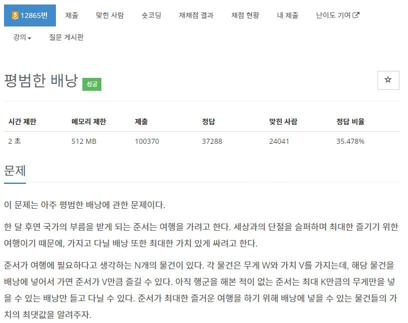 12865번: 평범한 배낭