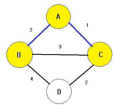 그 다음 작은 가중치를 갖는 간선은 B-C 인데, B-C를 연결하게 되면 이 그래프는 사이클을 갖게 된다.