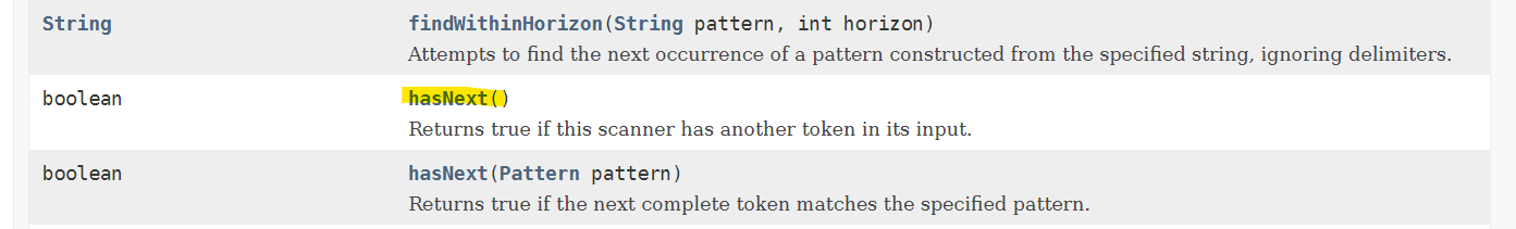 형광색으로 표시된 hasNext() 메소드의 설명을 보면 해당 Scanner 객체가 입력에 대한 토큰이 있는 경우 true를 반환한다고 되어 있다. 따라서 다음과 같이 구현하면 EOF를 판단할 수 있다.