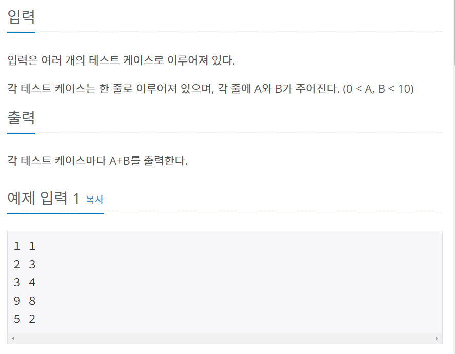 위의 경우 테스트 케이스가 한 줄로 이루어져 있을 뿐, 몇 개의 테스트 케이스가 주어질 것인지 명시되어 있지 않다. 이럴 때에는 입력을 받을 때 사용하는 클래스의 메소드 및 특성을 이용한다. 자바에서 입력을 받을 때 사용하는 Scanner와 BufferedReader 두 가지 클래스의 경우로 나누어 설명하겠다.