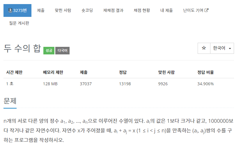 n개의 서로 다른 양의 정수 a1, a2, ..., an으로 이루어진 수열이 있다. ai의 값은 1보다 크거나 같고, 1000000보다 작거나 같은 자연수이다. 자연수 x가 주어졌을 때, ai + aj = x (1 ≤ i < j ≤ n)을 만족하는