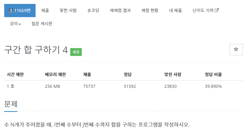 수 N개가 주어졌을 때, i번째 수부터 j번째 수까지의 합을 구해야 한다.