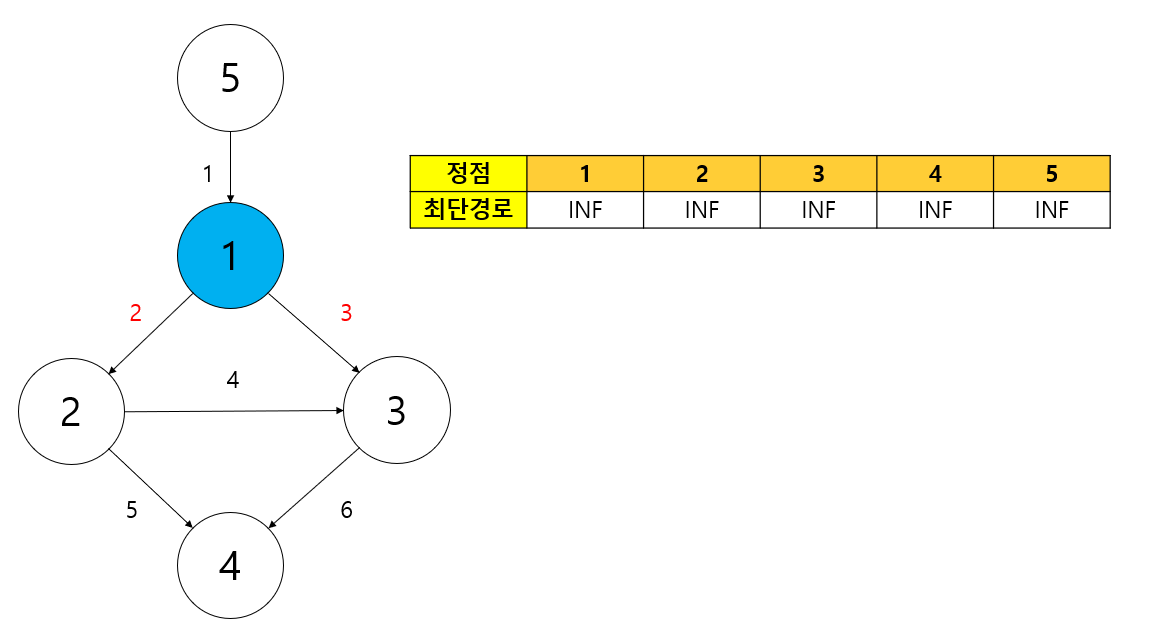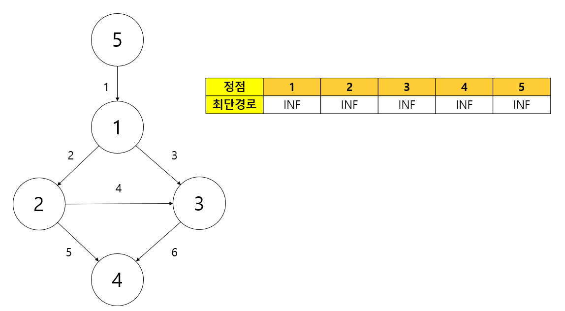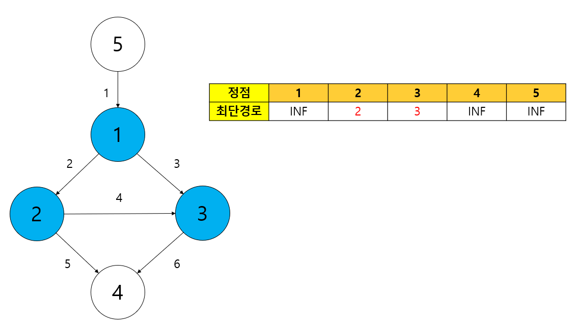 1번 정점은 출발 정점이기 때문에 최단 경로는 0이 되고 5번 정점의 경우 최단 거리 테이블이 갱신된 적이 없기 때문에 출발 정점에서 도달할 수 없는 정점이 된다.