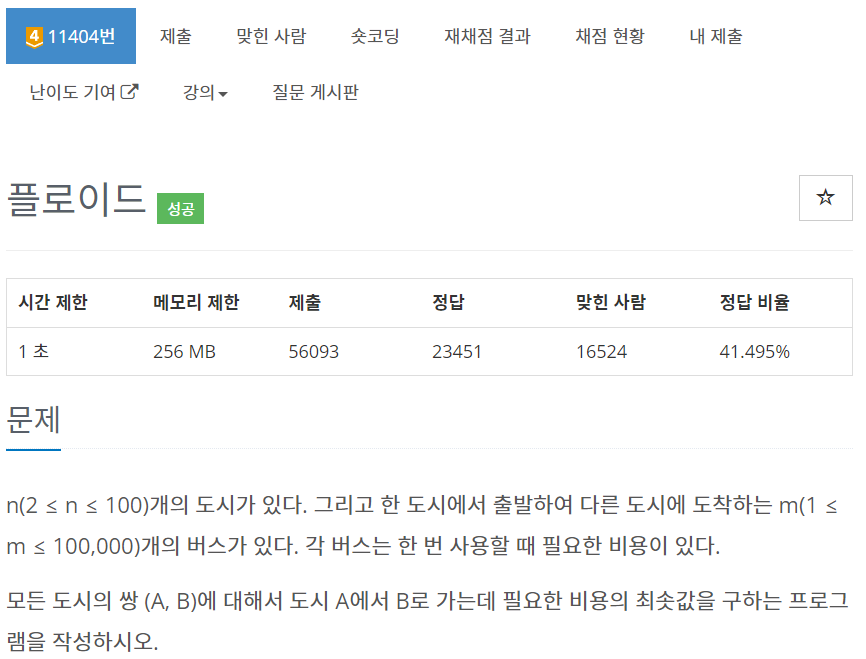 다만, 문제 조건에 의하면 시작 도시와 도착 도시를 연결하는 도선이 하나가 아닐 수도 있다고 하였다. 따라서 도시간 버스 노선에 대한 입력을 받으면서 도시 쌍 (A, B)에 대한 버스 비용을 더 작은 비용으로 갱신하는 과정을 추가해주어야 한다.
