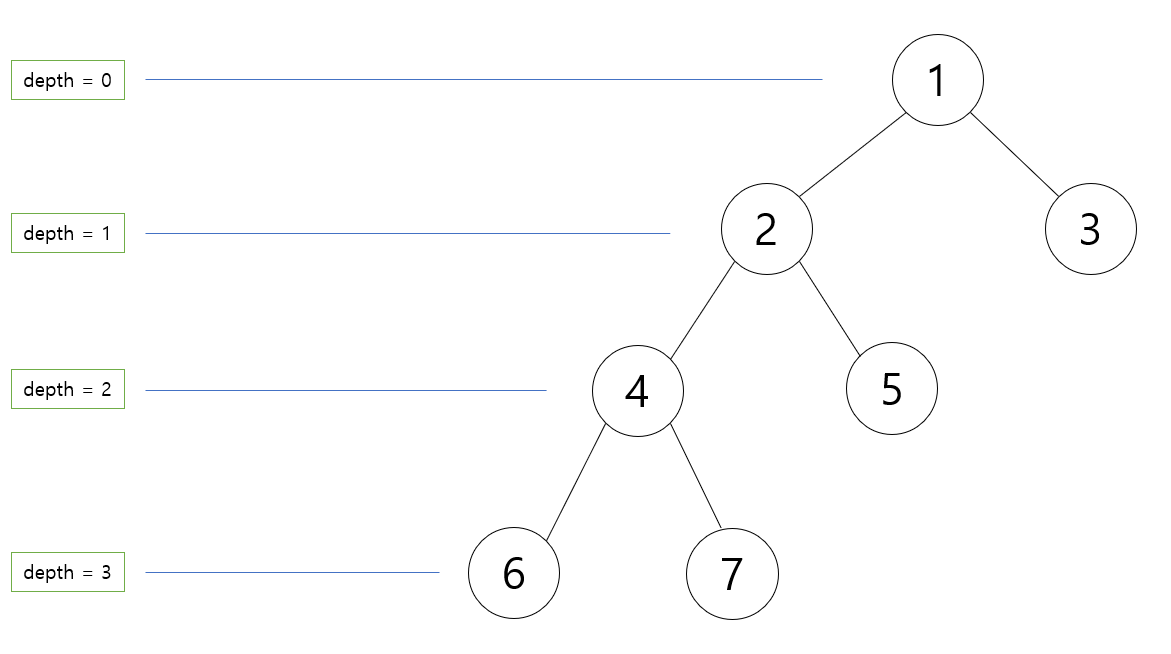 우선 루트 노드의 깊이 0 기준 구하고자 하는 두 노드의 깊이를 알아내야 한다. 트리에는 루트 노드로 부터 얼마나 떨어져 있는지를 나타내는 깊이라는 개념이 존재하는데, 특정 노드에 대한 깊이는 앞서 생성한 parent[] 배열을 따라 루트 노트까지 도달하면 알 수 있다.