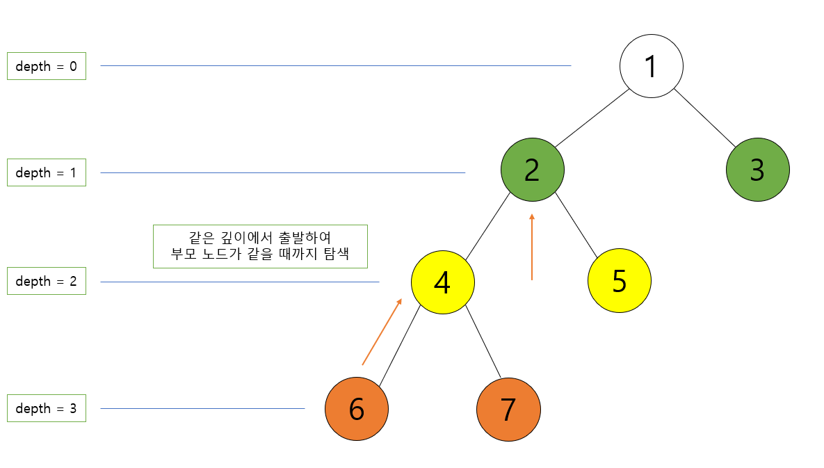 두 노드의 깊이를 알아냈다면 우선 두 노드의 깊이를 같게 만들어야 한다. 앞서 보았던 그림과 함께 그 이유를 말해보자면