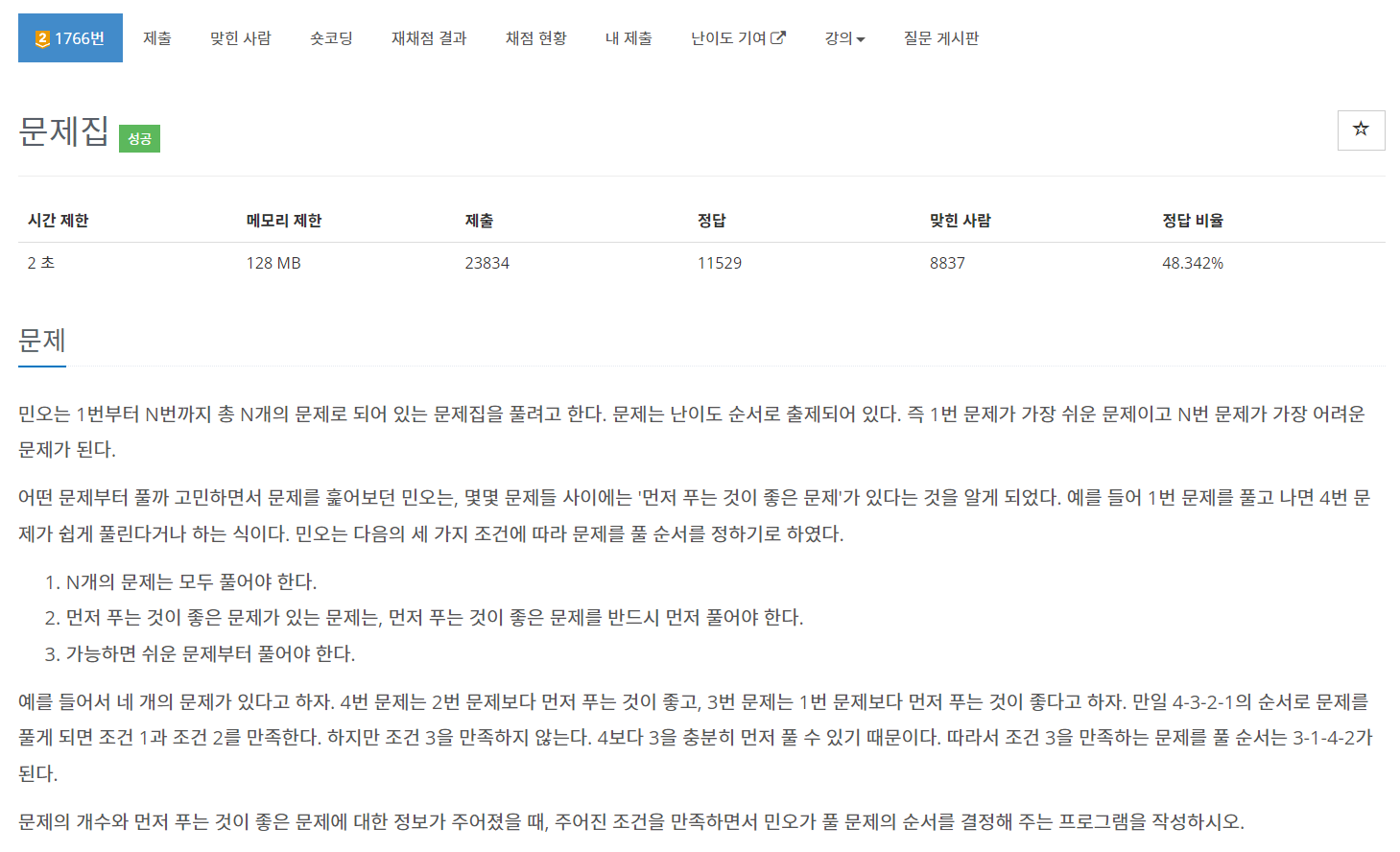 참고로 이 문제는 아래 문제를 먼저 해결하고 오면 보다 쉽게 풀이할 수 있다. 또한 아래 글에서 사용한 위상정렬 알고리즘과 이 문제에 사용한 방법이 크게 다르지 않으므로 이 글에서는 위상정렬 알고리즘을 구현하는 과정은 생략하도록 하겠다.
